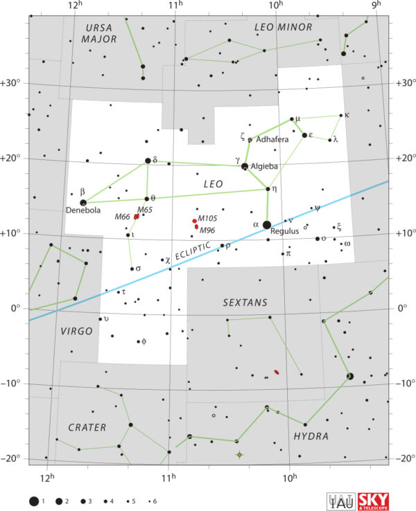 Leo Triplet (M65, M66, & NGC 3628): A trio of spiral galaxies in the Leo that are visible in a single, low-power field of view. M66 is the brightest at mag. 8.8 followed by M65 at 9.3 and NGC3628 at 9.5.