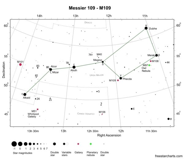 M108 and M109: Located in Ursa Major, with M109 often compared in structure to the Milky Way. M108 is seen edge. It shines at mag. 10. Look for nearby planetary M97 known as the Owl nebula. M109 is a barred spiral shining at mag. 9.8. Spiral structure may be glimsped in a medium sized telescope under dark skies.