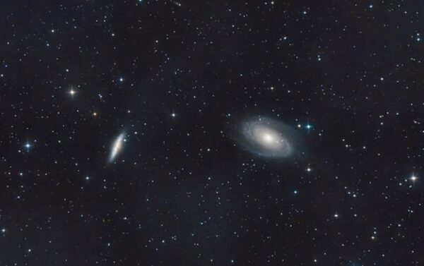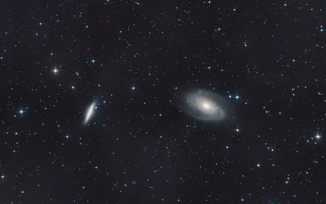 Bode’s Galaxy (M81) & Cigar Galaxy (M82): A bright spiral (M81) and a nearby starburst irregular galaxy (M82) found in Ursa Major. M81 is a large, bright, "face-on" spiral galaxy, while M82 is an "edge-on" galaxy. Both easily seen at mags. 6.9 and 8.4 for M82.