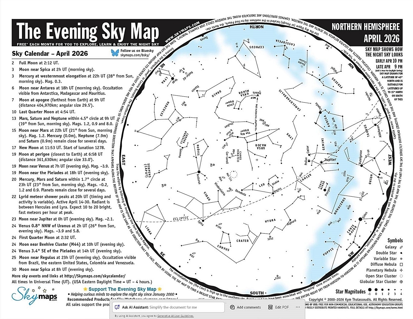April is peak "galaxy season," offering prime galaxy viewing as look away away from the Milky Way, revealing galaxies in Leo, Virgo, and Ursa Major. Highlights include the Whirlpool Galaxy, the Leo Triplet, and the Sombrero Galaxy, which are visible in modest sized telescopes under dark skies.