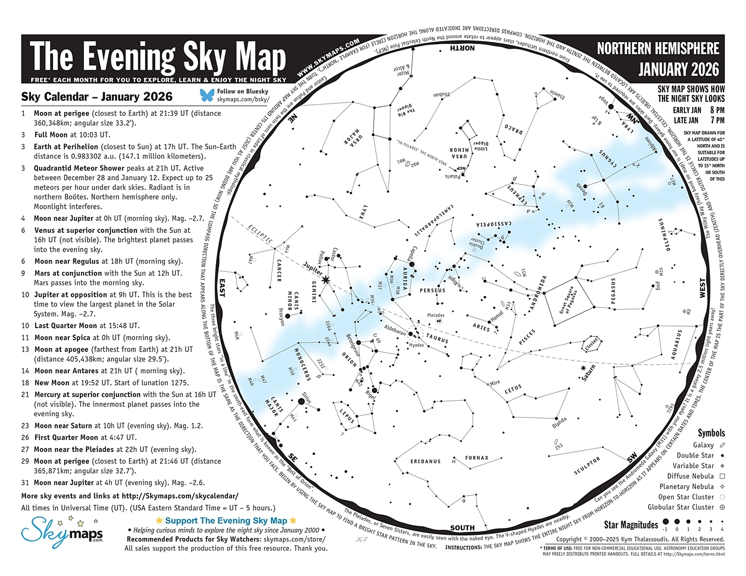 Winter finds Ursa Major (Big Dipper) climbing the northeastern sky, with the three stars of its handle pointing toward the horizon and the four stars of its bowl standing the highest. The entire sky rotates around a point near Polaris, a 2nd-magnitude star found by extending a line from the uppermost pair of stars in the bowl across the sky to the left of the Dipper. Polaris also performs two other valuable functions: The altitude of the star above the horizon equals your latitude north of the equator, and dropping a straight line from the star to the horizon points due north.