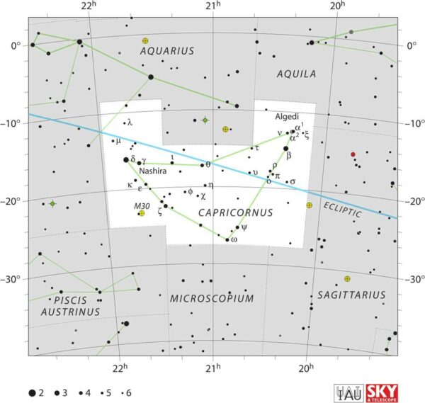 α1, α2 (alpha) Capricorni (α1, magnitudes 4.2 and 9.2, separation 45.4 arcseconds; α2, mags 3.6 and 9.3, sep 154.6”) The magnitude 4.2 (α1) and 3.6 (α2) stars form a naked eye pair separated by 376”. A 4 inch telescope will capture their 9th magnitude companions. Though an optical double it is still worth a look.