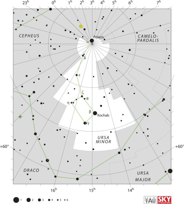 α (alpha) Ursae Minoris (mags 2.0 and 9.0, sep 18.4”) Polaris, the North Star. This is a classic light test for the common 60mm refractor. The 9th magnitude companion is hard to spot in the glare of the bright primary star. Fantastic in a large telescope; shows yellow and blue colors.