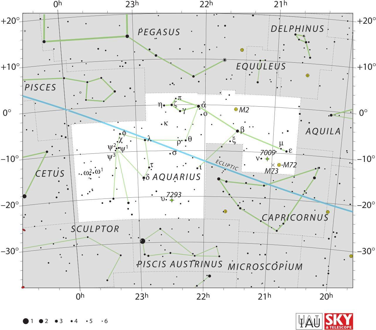 ζ (zeta) Aquarii (mags 4.3 and 4.5, sep 2.2”) A beautiful twin binary that is slowly widening from a minimum separation of 1.7”. A tough one so use at least 100X for a comfortable split.