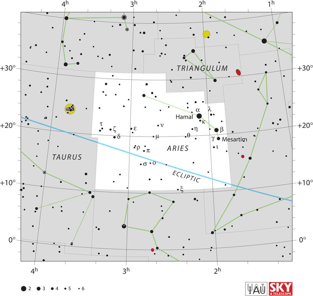 γ (gamma) Arietis (mags 4.8 and 4.8, sep 7.8”) A grand “twin” pair, both white. Their telescopic appearance are like the headlights of a oncoming automobile, are really cool looking!