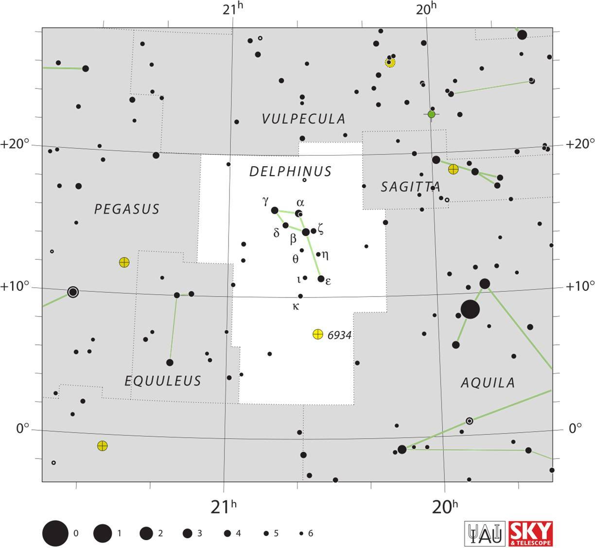 γ (gamma) Delphini (mags 4.5 and 5.5, sep 9.6”) One of the finest double stars for small telescopes. The pair’s subtle yellow and blue colors are sometimes a challenge.